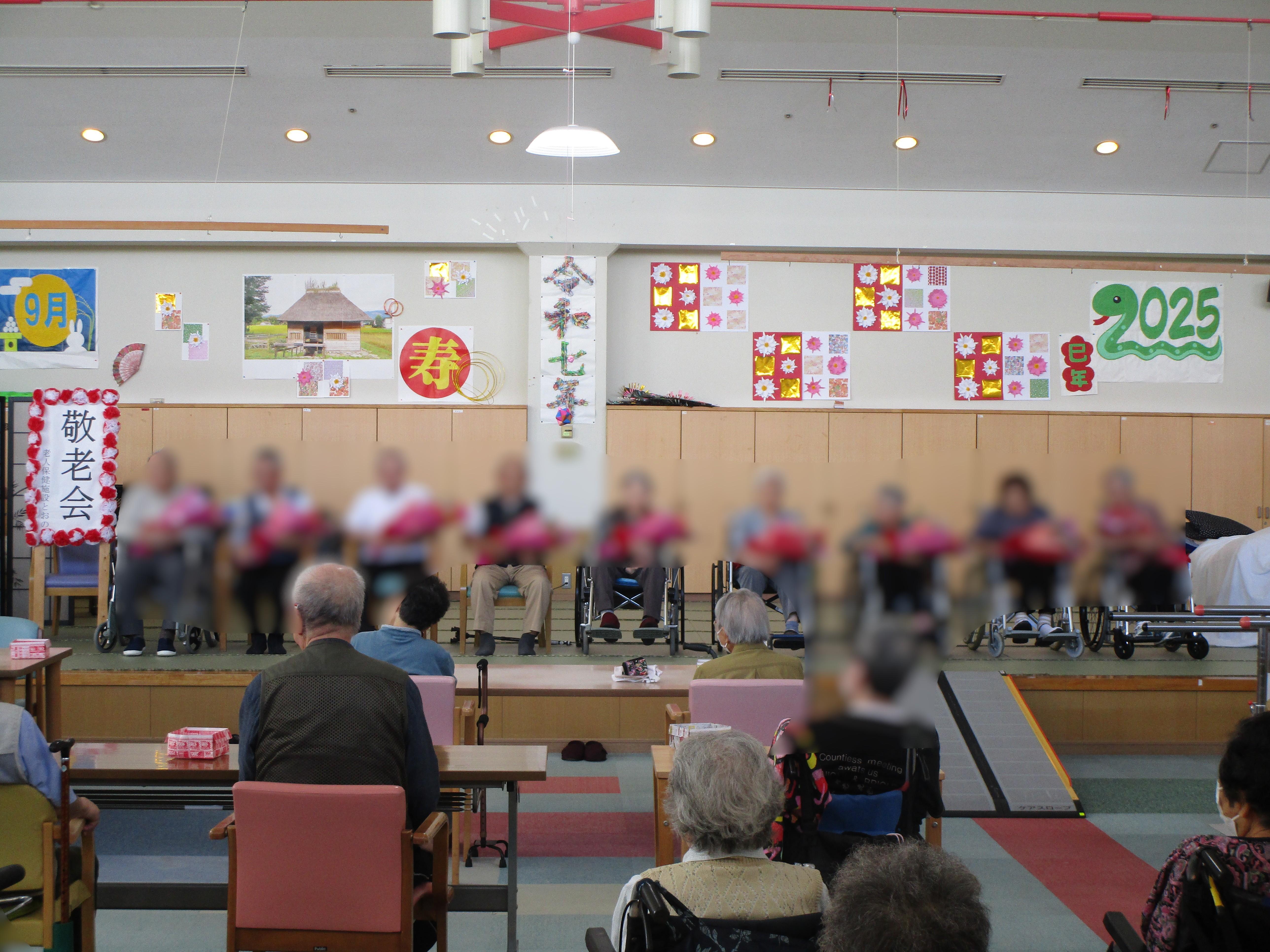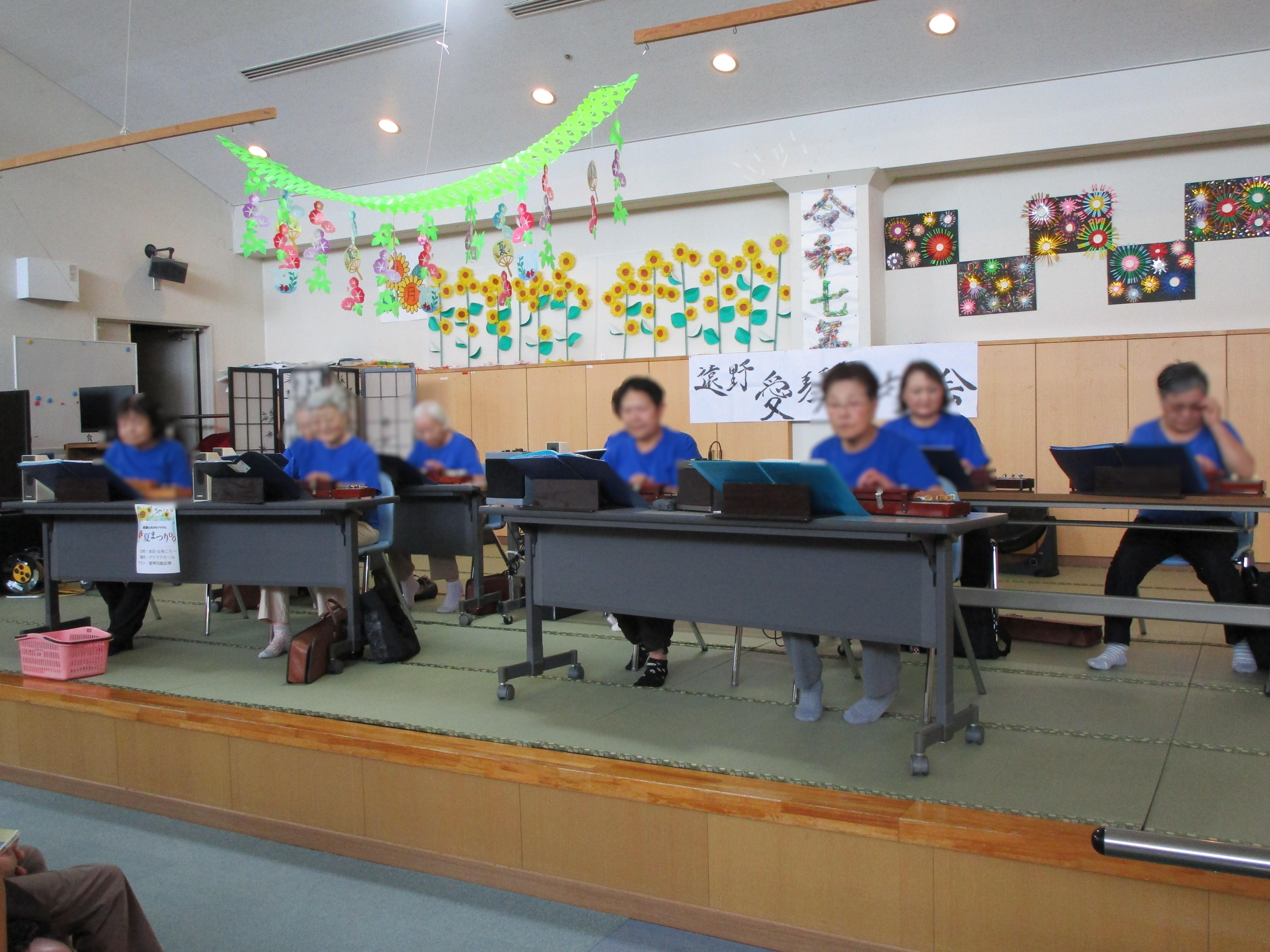 デイケアホールにて夏祭りを行いました。ゲストとして愛琴同趣会の皆さまをお招きし、大正琴の演奏を披露していただきました。懐かしい昭和歌謡など心に響くメロディが施設内に優しく流れ、利用者さんたちは目を輝かせながら耳を傾けていました。